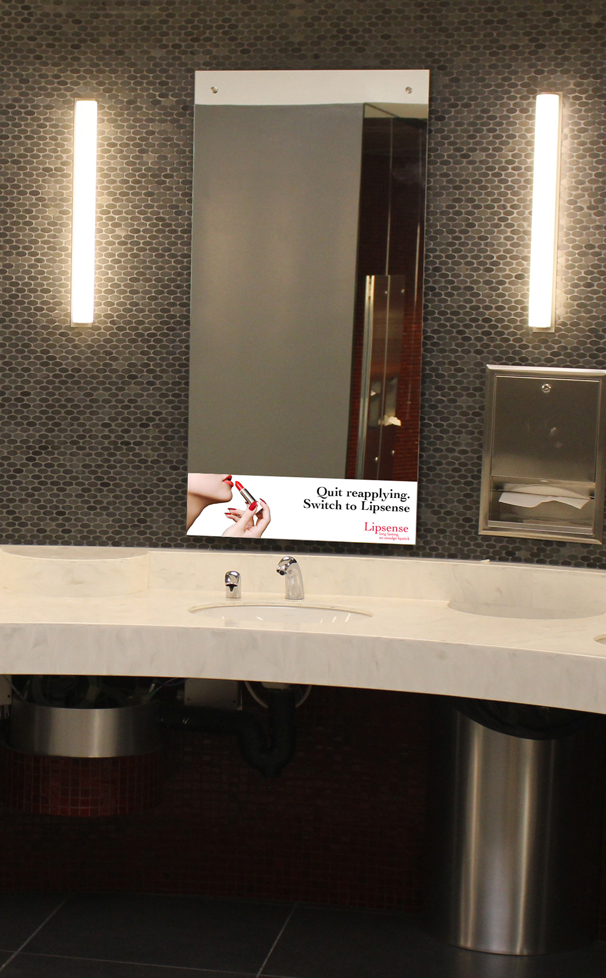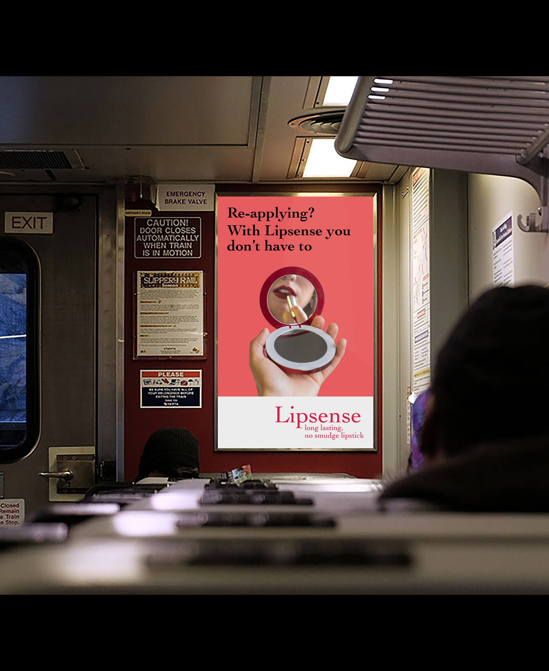 I did this Lipsense campaign for my Advertising Design class. We were tasked with creating an ad campaign for an existing product or company, featuring a variety of ad mediums. For my campaign I wanted to focus on Lipsense’s properties of being smudge and transfer proof and long lasting. I thought about scenarios where women might leave lipstick transfer behind, like when kissing someone, and where women often apply lipstick, in bathrooms or while traveling on buses or trains. The campaign is meant to reach women where they might be applying or thinking out their lipstick.